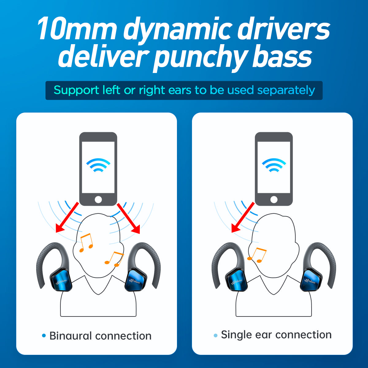 - 【Stable & Comfortable Fit Your Ear】- Ergonomically designed flexible ear loop with gel-flexible silicone earplugs to ensure your headphones fit comfortably to the ears and remains stable during your workouts. Each earbud can be used independently, if one is out of power, it will automatically switch to paired the other one.